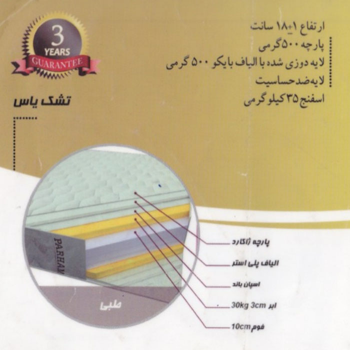 تشک پرهام طبی مدل یاس/پارچه رویه ژاگارد و فوم/ الیاف 500 گرمی بایکو/ ابر 30 کیلویی/ ارتفاع 18 سانتی متر/ ضمانت 3 سال